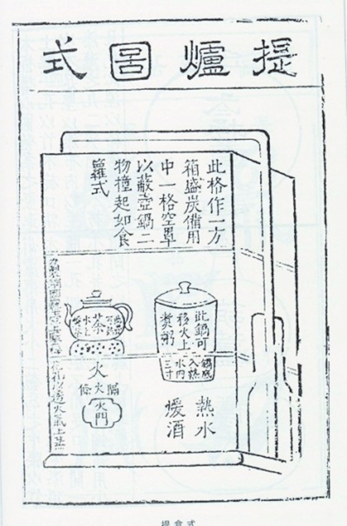 明代戲曲家高濂編撰的《遵生八箋》,可謂士大夫精致生活的指導(dǎo)書,書中仔細(xì)介紹了提爐的形制與結(jié)構(gòu),還附上了插圖。書云:“式如提盒,亦余制也。高一尺八寸,闊一尺,長一尺二寸,作三撞。下層一格,如方匣,內(nèi)用銅造水火爐,身如匣方,坐嵌匣內(nèi)。中分二孔,左孔炷火,置茶壺以供茶;右孔注湯,置一桶子小鑊有蓋,頓湯中煮酒。長日午余,此鑊可煮粥供客。傍鑿一小孔,出灰進(jìn)風(fēng)。其壺鑊迥出爐格上,太露不雅,外作如下格方匣一格,但不用底以罩之,便壺鑊不外見也。一虛一實(shí)共二格,上加一格,置底蓋以裝炭,總?cè)癯梢患?,上可箾關(guān),與提盒作一副也?!?/p>