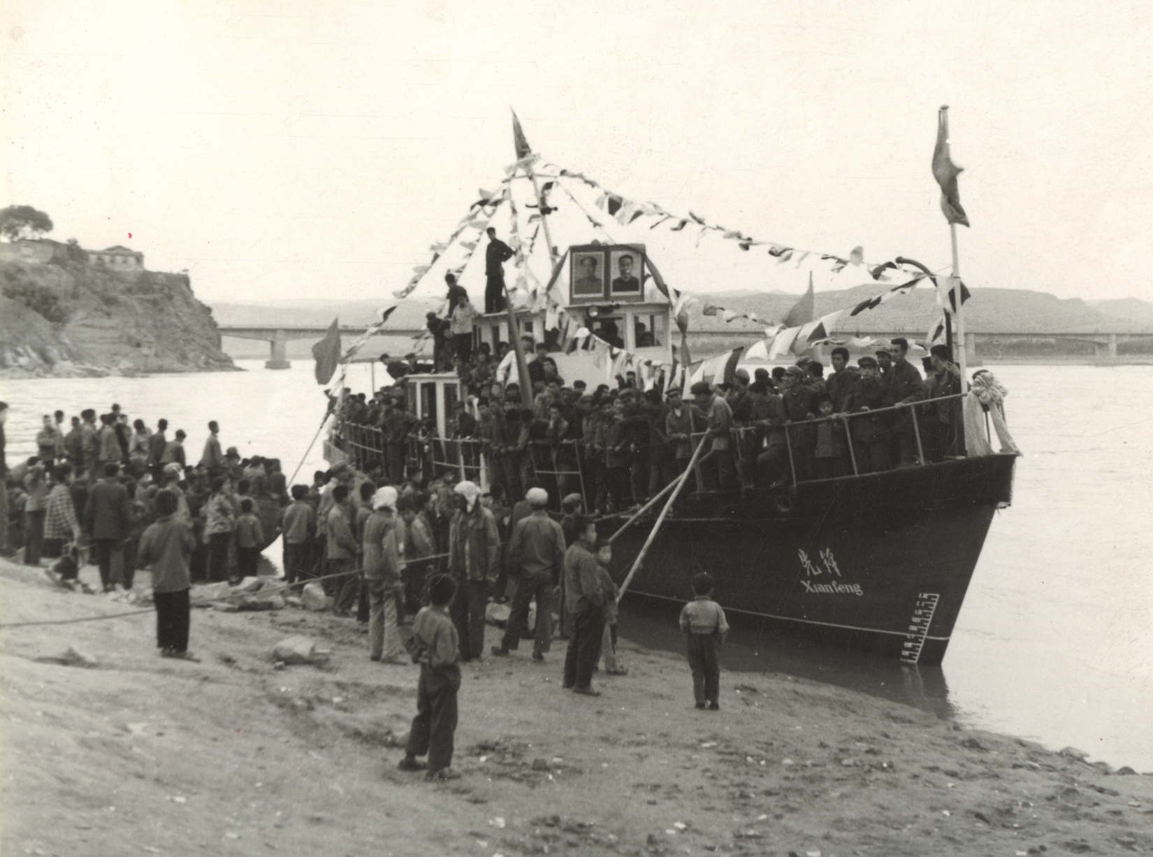 保德縣的木船造得快,取名“先鋒號”,于1977年5月23日,農(nóng)歷四月初六正式下水。這是晉陜峽谷有史以來第一艘機動船,千年未有之新鮮事,少不了要隆重慶賀。有老照片記錄當(dāng)年盛況:黃河水流浩大,“先鋒號”泊于岸邊,駕駛艙頂上并排矗立著偉人的大幅畫像,上用紅綢花裝飾,船頭船尾紅旗招展,四條彩帶從駕駛艙頂端連向船沿。縣領(lǐng)導(dǎo)排坐于船上,禮儀小姐扯著紅綢,河岸上站滿了看熱鬧的群眾。河風(fēng)吹動大小旗幟,機船顯得威風(fēng)凜凜。