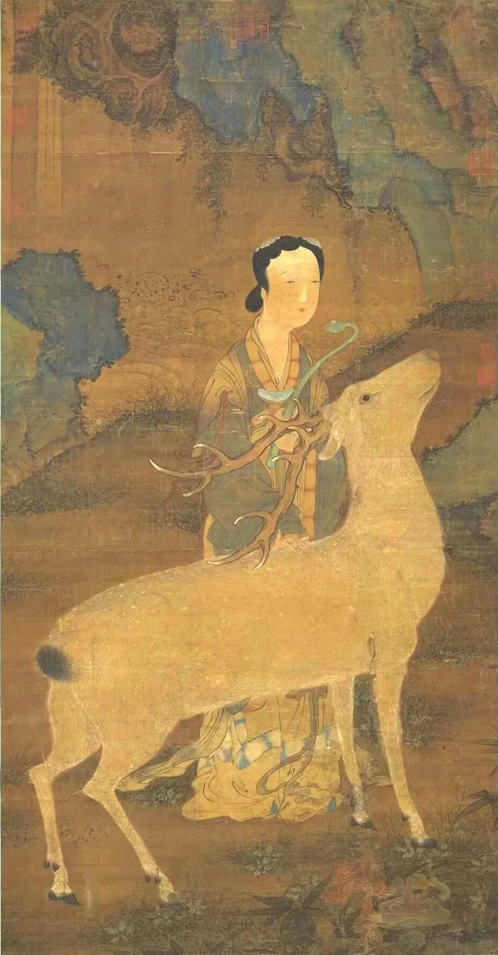 在傳統(tǒng)文化中,鹿是一種有神力的動(dòng)物,神話傳說中鹿往往是神仙的坐騎。李白一生尋仙問道,其《夢游天姥吟留別》中有“且放白鹿青崖間,須行即騎訪名山”之名句。南極仙翁的白鹿,不僅被繪制在壽畫里,在文學(xué)中也大放異彩?!段饔斡洝分械陌茁咕褪菈坌悄蠘O仙翁的坐騎,偷得壽星的蟠龍拐杖后下凡為妖。在《白蛇傳》里,白娘子獨(dú)闖昆侖山,欲盜取起死回生的靈芝仙草,遭遇鶴、鹿二仙童阻攔。清代神魔小說《女仙外史》中的鹿童化為道人,下凡后為禍人間。屢破票房紀(jì)錄的動(dòng)畫電影《哪吒2》,其中的反派之一鹿童,是無量仙翁的大弟子,擔(dān)任捕妖隊(duì)頭領(lǐng),戲份頗重。
