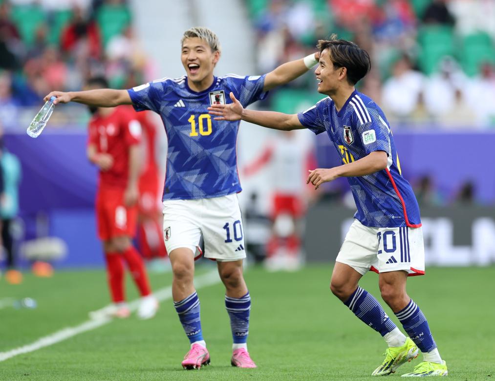 1月31日,日本隊球員久保建英(右)與堂安律慶祝進球。新華社記者 賈浩成 攝