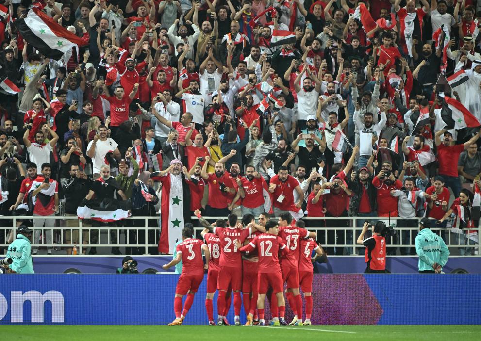 1月31日,敘利亞隊點球扳平比分后與球迷慶祝。新華社記者 孫凡越 攝