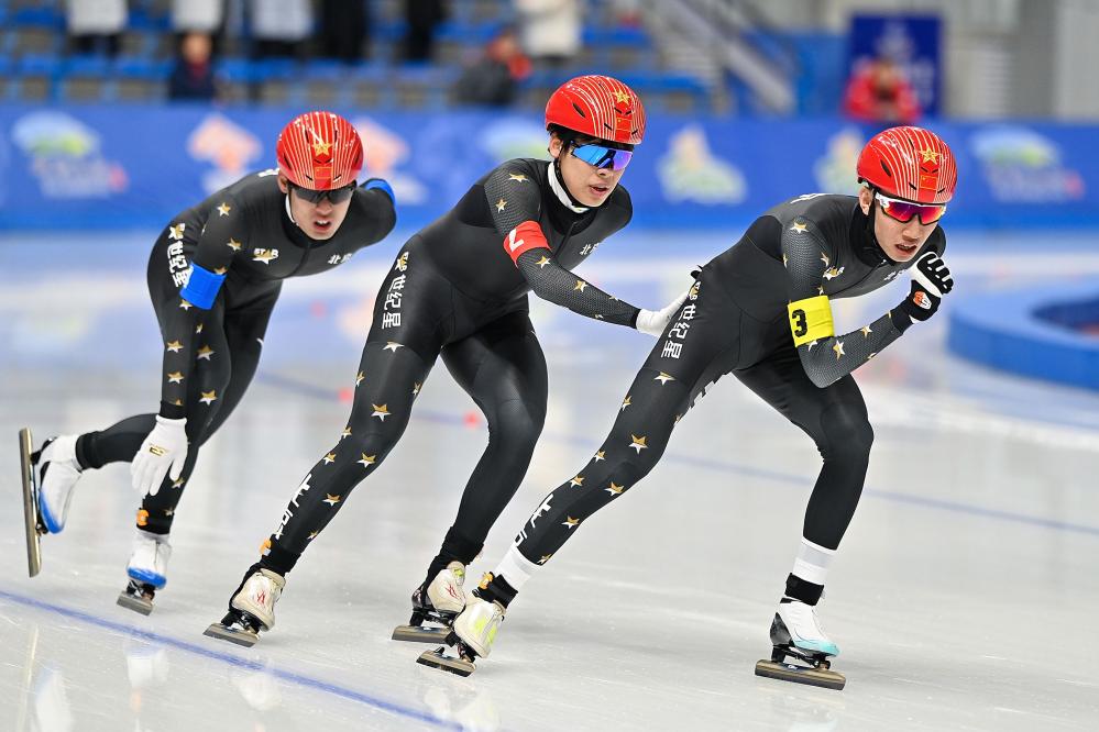 男子團(tuán)體追逐決賽是速滑青年組的最后一場比賽,北京隊以3分52秒69的成績摘得金牌,并打破該項目全國青年紀(jì)錄。