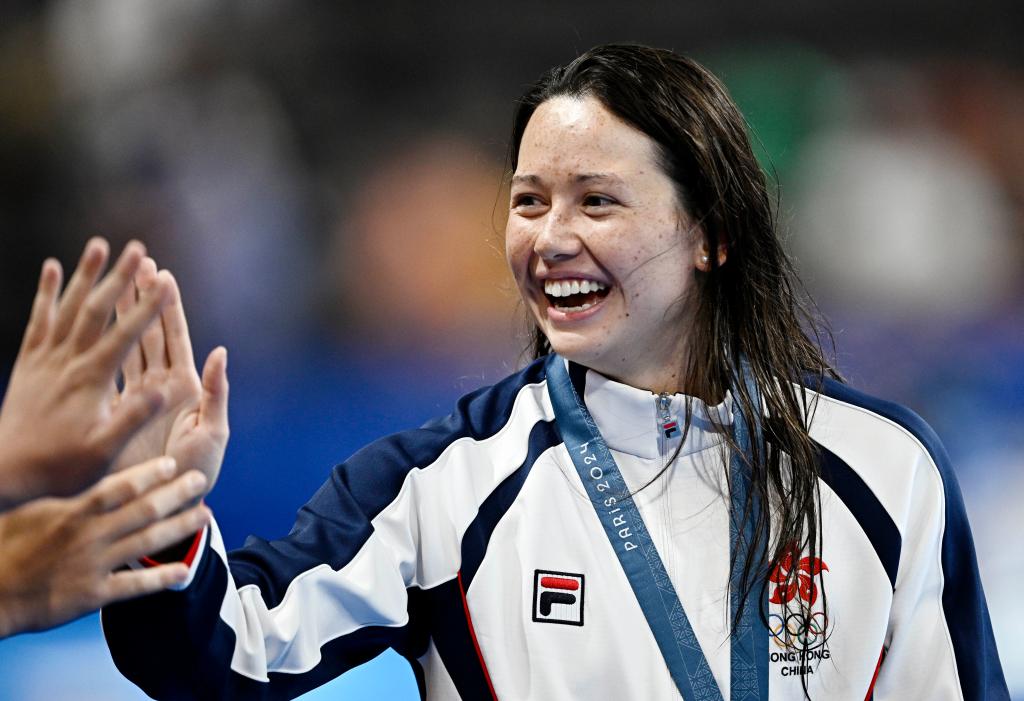 7月29日,季軍中國香港選手何詩蓓在頒獎儀式后。當日,巴黎奧運會游泳女子200米自由泳決賽在拉德芳斯體育館舉行。新華社記者 王鵬 攝