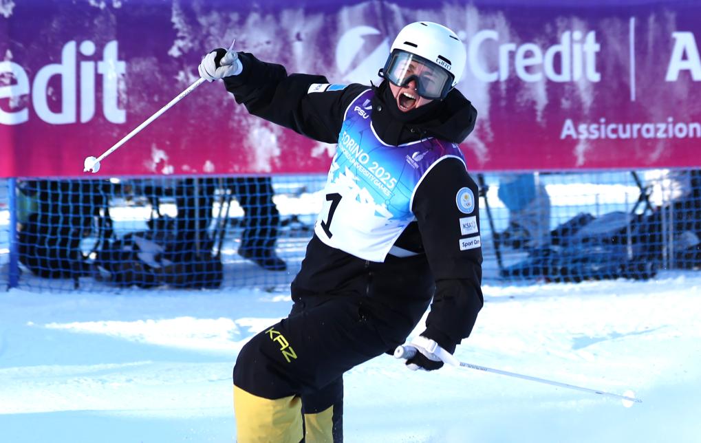 1月14日,哈薩克斯坦選手阿納斯塔西婭·戈羅德科抵達終點后慶祝。當日,在意大利舉行的2025年都靈大冬會自由式滑雪雪上技巧女子組決賽中,哈薩克斯坦選手阿納斯塔西婭·戈羅德科奪得冠軍,日本選手中尾春香和德國選手威斯分獲二、三名。新華社記者 張晨 攝