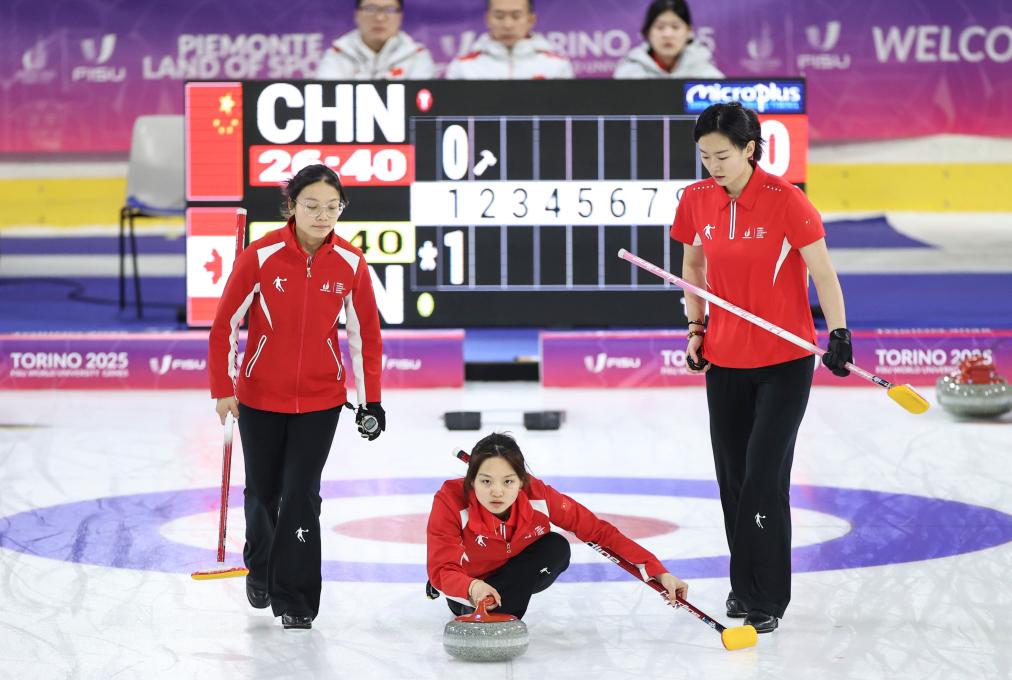 同樣在塔佐利冰上運(yùn)動(dòng)中心進(jìn)行的還有冰壺比賽,由北京體育大學(xué)學(xué)生尹子怡、渠偌萱、譚斯婷、裴君杭、葉紫萱組成的中國(guó)女隊(duì),先是在白天的比賽中以4:6不敵日本隊(duì),隨后又在晚間的最后一輪循環(huán)賽中以3:6不敵加拿大隊(duì),最終以5勝4負(fù)的成績(jī)排名循環(huán)賽第五,無(wú)緣四強(qiáng)。