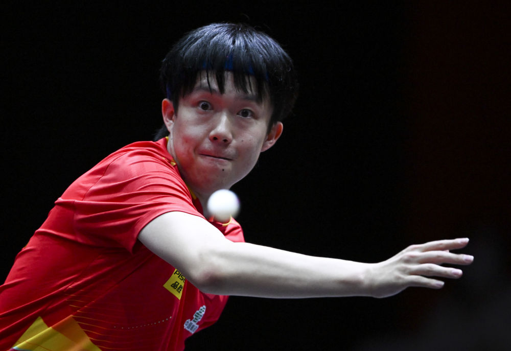 5月20日,王楚欽在比賽中回球。新華社記者 賀長(zhǎng)山 攝