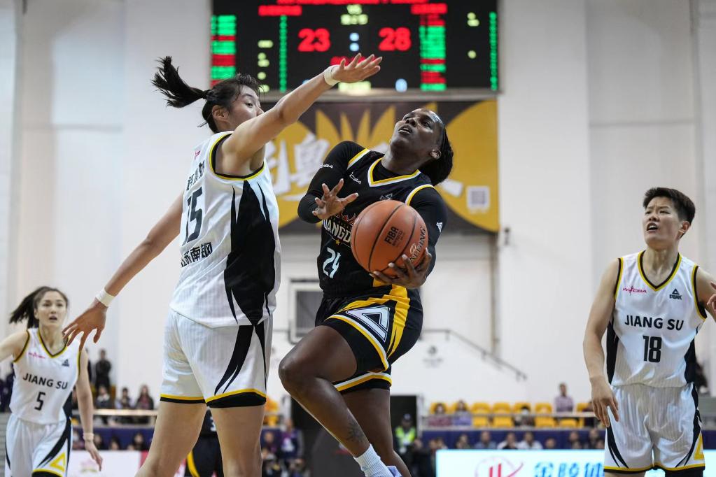 首節(jié)兩隊進攻成功率都不高,本節(jié)結束時江蘇隊以16:13領先。孫宇成為江蘇隊在第二節(jié)中的“奇兵”,她單節(jié)得到11分,東莞隊則依靠卡多佐的內(nèi)線優(yōu)勢保持著比分上的均勢。上半場結束,東莞隊落后3分。