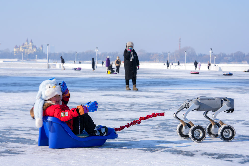 1月11日,小朋友在松花江哈爾濱段江面上體驗(yàn)機(jī)器狗拉爬犁。新華社記者 王建威 攝