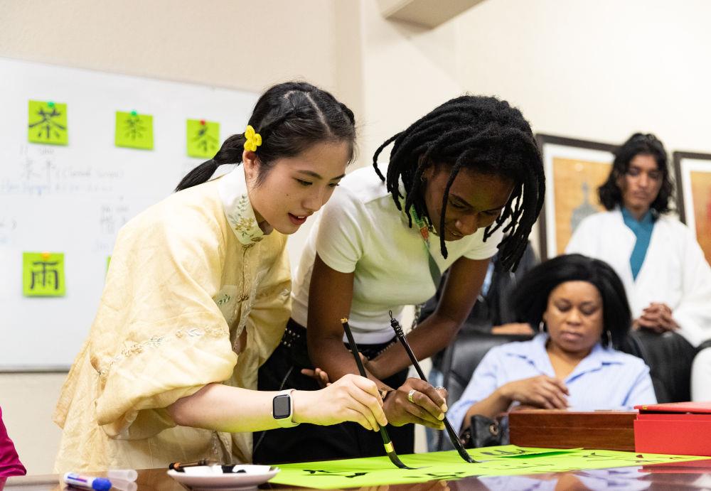 △2025年4月17日,在南非約翰內(nèi)斯堡,學(xué)生與孔子學(xué)院志愿者在“國際中文日”活動(dòng)上寫毛筆字。