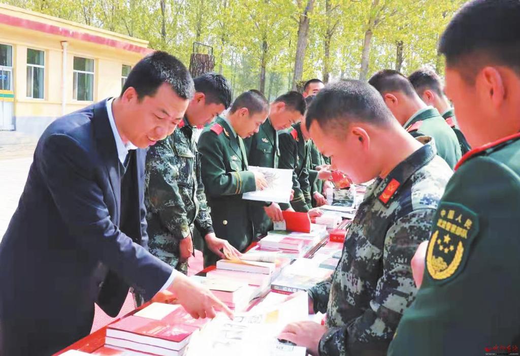 為豐富駐忻武警官兵的文化生活,近日,市新華書店開展了“送書進(jìn)軍營(yíng)”活動(dòng),給武警官兵帶去了豐富的精神食糧。(張存良 攝)