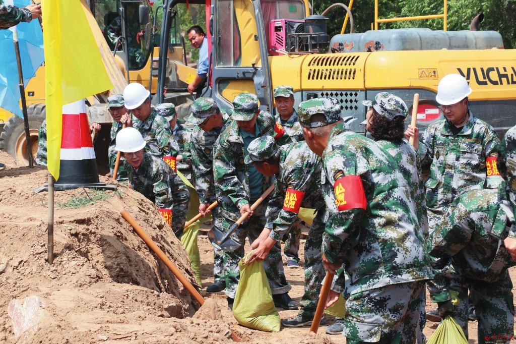6月12日,原平市交通建設(shè)中心舉行了防汛應(yīng)急搶險(xiǎn)演練,檢驗(yàn)了全體職工防汛搶險(xiǎn)組織能力、快速反應(yīng)能力和現(xiàn)場(chǎng)操作能力,全力確保安全度汛。圖為演練人員裝土袋搶修變道。(劉建春 攝)