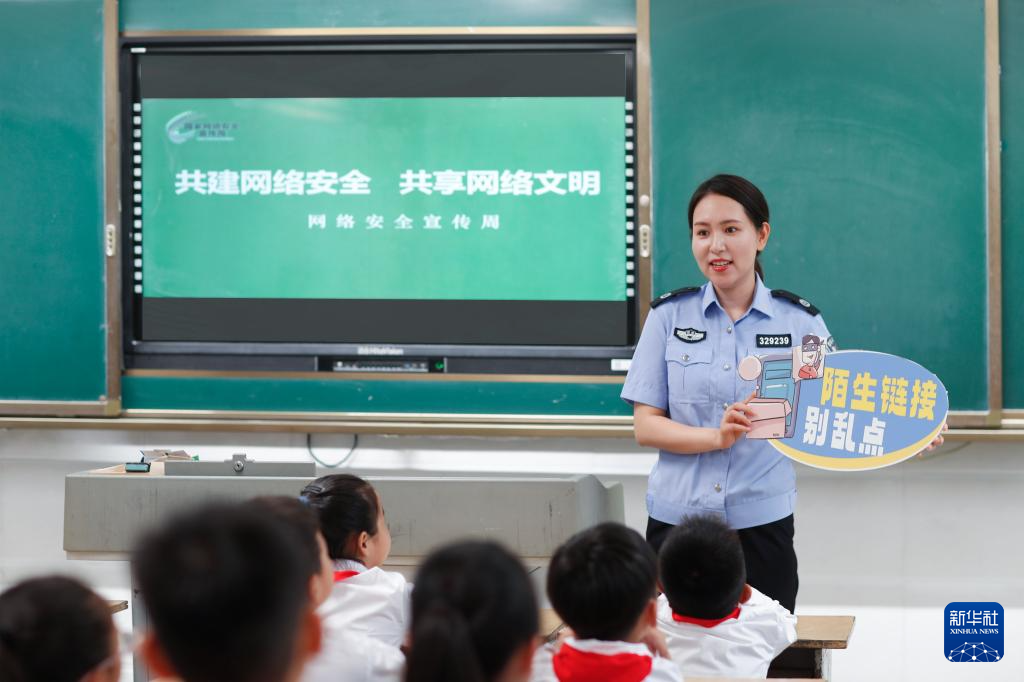 9月11日,公安民警在貴州省銅仁市玉屏侗族自治縣印山民族小學給學生講解網(wǎng)絡安全知識。(新華社發(fā) 胡攀學 攝)