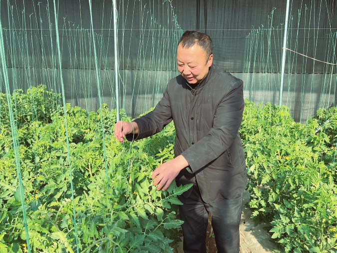 陽高縣迎春蔬菜種植專業(yè)合作社負責(zé)人王學(xué)斌在育苗示范基地查看小番茄苗長勢。 本報通訊員攝