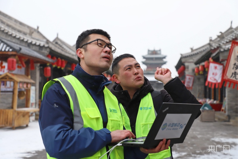 離開商鋪,郭勇和同事又來到古縣城十字街的中心點,這里是古縣城人流最為密集的地方,也是游客用網(wǎng)需求最大的地方?!霸谥行奈恢茫覀兎胖昧?個5G基站,同時在城墻外放置了6個,內(nèi)城墻上放置了7個,還在一些網(wǎng)絡(luò)覆蓋較弱的小街道放置了‘微站’設(shè)備進行擴容。春節(jié)期間,我們還會組織應急保障隊進行通信保障,通過這樣的基站布局最大限度保障游客的通信順暢。”說話間,郭勇和同事一人操作電腦,一人操作手機已經(jīng)完成了此處的信號測試。