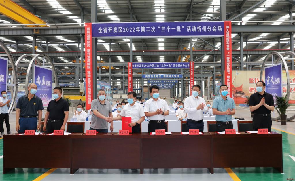 在定襄經(jīng)濟(jì)技術(shù)開發(fā)區(qū)寶航重工有限公司車間,與省主會(huì)場同步,李建國主持舉行了忻州市“簽約一批”代表項(xiàng)目集中簽約活動(dòng)。忻州經(jīng)濟(jì)開發(fā)區(qū)與山西汽運(yùn)集團(tuán)“汽運(yùn)網(wǎng)絡(luò)貨運(yùn)數(shù)字產(chǎn)業(yè)園項(xiàng)目”、原平經(jīng)濟(jì)技術(shù)開發(fā)區(qū)與山西晉海清潔能源有限公司“500MW/1GWh共享儲能電站項(xiàng)目”、繁峙經(jīng)濟(jì)技術(shù)開發(fā)區(qū)與山西華茂智能新材料有限公司“綜合治理提升工程項(xiàng)目”、定襄經(jīng)濟(jì)技術(shù)開發(fā)區(qū)與德?;饘僦破酚邢薰尽澳昙庸?000噸鋼材項(xiàng)目”、靜樂現(xiàn)代農(nóng)業(yè)產(chǎn)業(yè)示范區(qū)與北京中和智谷循環(huán)經(jīng)濟(jì)科技有限公司“200MW農(nóng)牧光儲一體化項(xiàng)目”、神池現(xiàn)代農(nóng)業(yè)產(chǎn)業(yè)示范區(qū)與中國郵政集團(tuán)“郵件處理中心項(xiàng)目”、五臺現(xiàn)代農(nóng)業(yè)產(chǎn)業(yè)示范區(qū)與雄縣方濟(jì)商貿(mào)有限公司“特色豆制品加工項(xiàng)目”、岢嵐經(jīng)濟(jì)技術(shù)開發(fā)區(qū)與中科人工智能科技有限公司“航天科技產(chǎn)業(yè)園項(xiàng)目”等8個(gè)代表項(xiàng)目分兩個(gè)批次進(jìn)行了簽約。