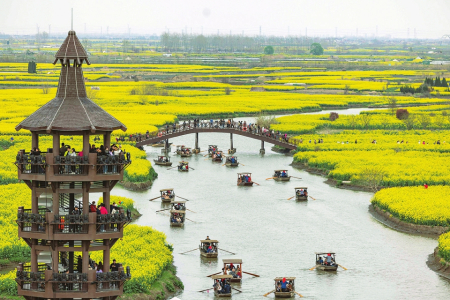 4月4日,游客在江蘇興化千垛菜花景區(qū)乘船游覽。據(jù)新華社