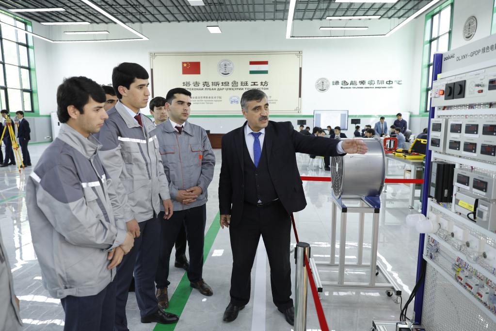2023年4月12日,在塔吉克斯坦首都杜尚別的魯班工坊內(nèi),塔方教授向?qū)W生講解綠色電能展示平臺的功能與使用方法。新華社發(fā)(奧斯帕諾夫攝)