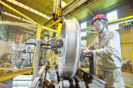6月14日,暑氣已盛,記者走進太原重工軌道交通設(shè)備有限公司車輪廠二線生產(chǎn)車間,只見一排排銀灰色車輪陳列有序,即將作為高鐵之足奔馳于世界各地,閃耀中國制造的熠熠光華。
