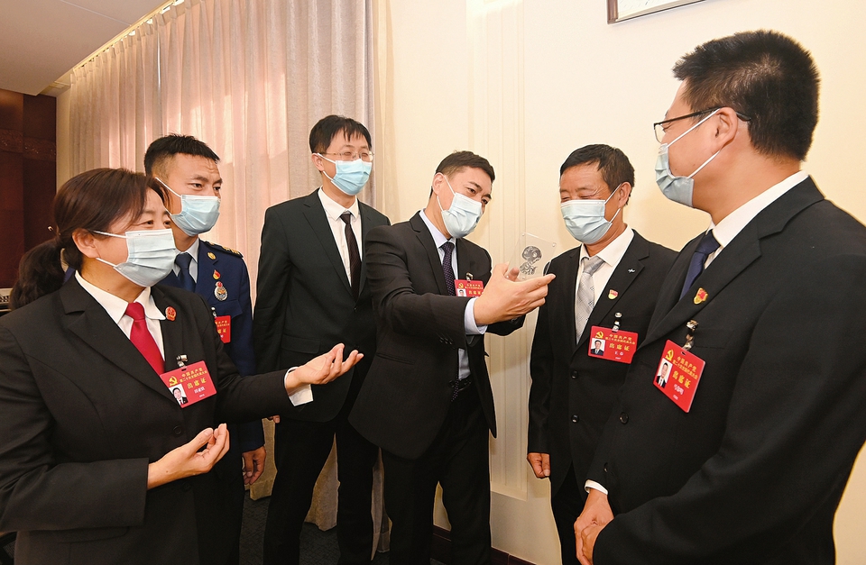 10月18日,出席黨的二十大的山西團(tuán)代表田亞欣、張高峰、張靖、牛國(guó)棟、王春、馬黎明(自左至右)在會(huì)議間隙圍繞創(chuàng)新是第一動(dòng)力話(huà)題展開(kāi)討論。(記者李聯(lián)軍攝)