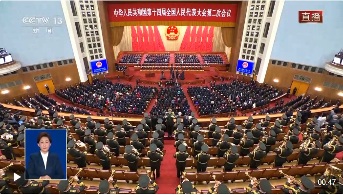 3月5日上午9時(shí),十四屆全國(guó)人大二次會(huì)議在人民大會(huì)堂開(kāi)幕,全體起立,高唱中華人民共和國(guó)國(guó)歌。
