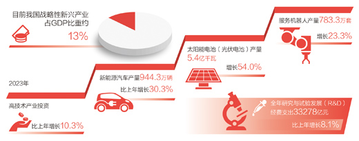 “發(fā)展新質(zhì)生產(chǎn)力,既有利于培育發(fā)展一批產(chǎn)業(yè)規(guī)模大、帶動能力強(qiáng)的支柱產(chǎn)業(yè),也有利于加快傳統(tǒng)產(chǎn)業(yè)轉(zhuǎn)型升級,增強(qiáng)我國經(jīng)濟(jì)發(fā)展韌性,推動經(jīng)濟(jì)實現(xiàn)質(zhì)的有效提升和量的合理增長。”中山大學(xué)黨委副書記、校長高松代表說。2023年,我國高技術(shù)制造業(yè)增加值增長2.7%,高技術(shù)產(chǎn)業(yè)投資比上年增長10.3%,新動能不斷積蓄。