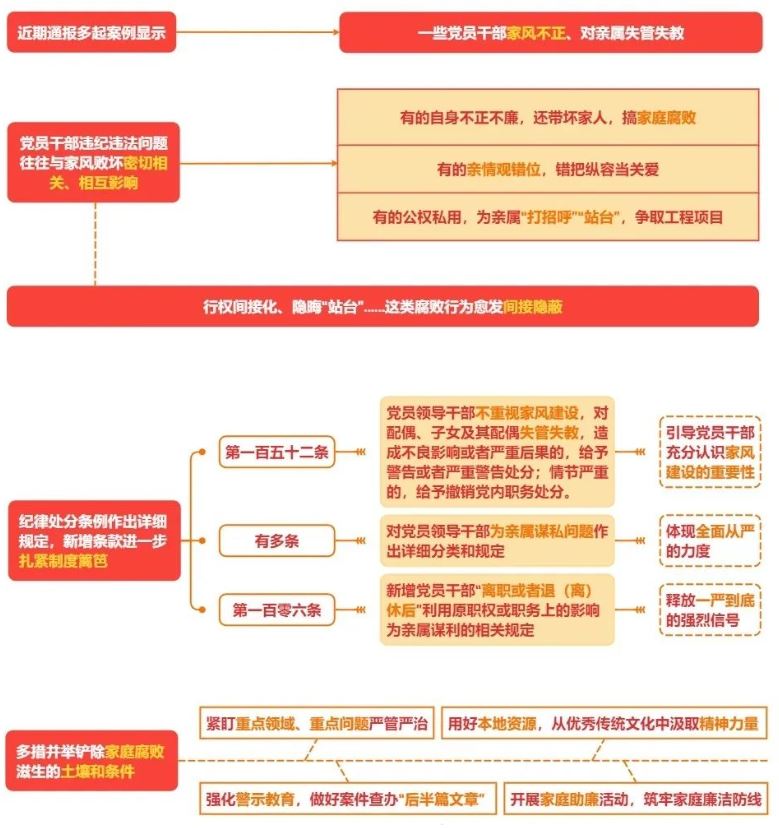 新修訂的《中國(guó)共產(chǎn)黨紀(jì)律處分條例》第一百五十二條對(duì)黨員領(lǐng)導(dǎo)干部“不重視家風(fēng)建設(shè),對(duì)配偶、子女及其配偶失管失教,造成不良影響或者嚴(yán)重后果”的情況作出規(guī)定,引導(dǎo)黨員干部充分認(rèn)識(shí)家風(fēng)建設(shè)的重要性。