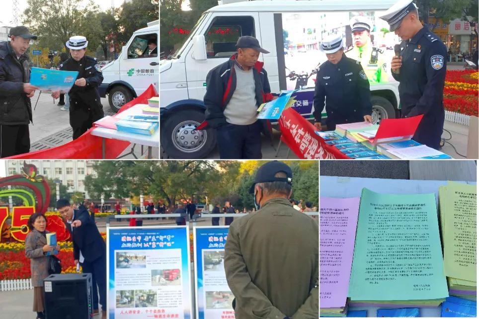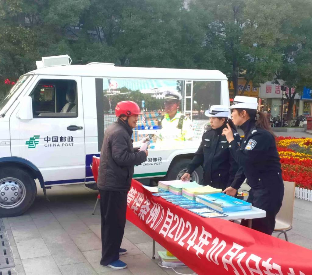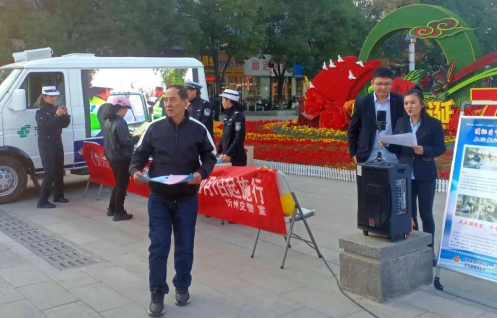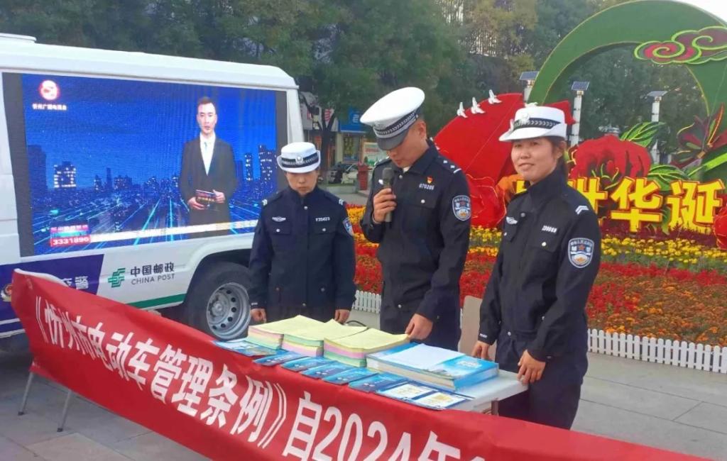 在人頭攢動的廣場上,“一盔一帶”宣傳展板、警郵直播車大屏幕吸引了過往群眾駐足觀看?!按髬專滦抻喌摹缎弥菔须妱榆嚬芾項l例》已于本月1日起開始施行,您知道嗎?”“大叔,您這舊的電動自行車要抓緊時間登記備案、辦理臨時牌照,咱忻府區(qū)24個警郵合作電動自行車便民登記服務(wù)網(wǎng)點都能辦理過渡期臨牌”“騎乘電動自行車必須要佩戴安全頭盔,不能闖紅燈、逆行......”