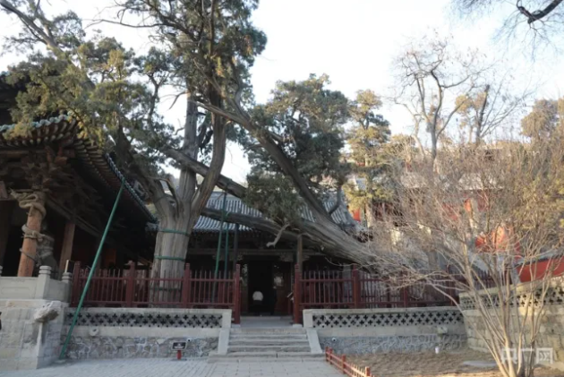 三千年晉祠的“見證者”——周柏。周柏長于圣母殿右側(cè),18米長的周柏向南傾斜生長,被另一株古柏所支撐,樹葉披覆在圣母殿頂,樹干粗壯,得幾人才能合抱,像一條橫臥的巨龍,因此有“臥龍柏”之美譽。經(jīng)科學測定,此樹已有二千九百九十多歲。在晉祠,樹齡在千年以上的蒼松、翠柏、古槐等尚存二十余株,它們和古柏一起見證著晉祠的悠悠歷史。