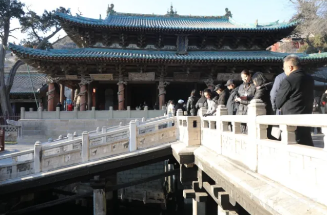 中國最早的水陸立交橋——魚沼飛梁。魚沼飛梁西依圣母殿,東鄰獻殿,初建在北魏之前。飛梁的形式古樸,橫跨于魚沼之上,借以觀賞景物,南北東西四面伸長,如鳥之振翼欲飛狀,是中國少有的一種十字橋梁形式,被譽為中國最早的水陸立交橋。