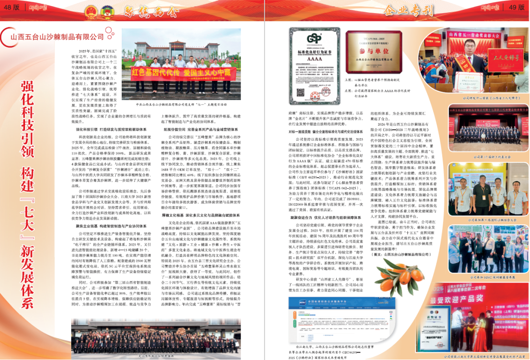 2025年,是國家“十四五”收官之年,也是山西五臺山沙棘制品有限公司上一個(gè)三年戰(zhàn)略規(guī)劃的收官之年。在復(fù)雜嚴(yán)峻的宏觀環(huán)境下,全體五臺山沙棘人同心聚力、迎難而上,緊緊圍繞沙棘產(chǎn)業(yè)化,強(qiáng)化戰(zhàn)略引領(lǐng),統(tǒng)籌推進(jìn)“七大體系”建設(shè),不僅實(shí)現(xiàn)了生產(chǎn)經(jīng)營的穩(wěn)健發(fā)展,更在發(fā)展質(zhì)量上取得了實(shí)質(zhì)性突破,圓滿完成了階段性戰(zhàn)略任務(wù),實(shí)現(xiàn)了企業(yè)量的合理增長與質(zhì)的有效提升。